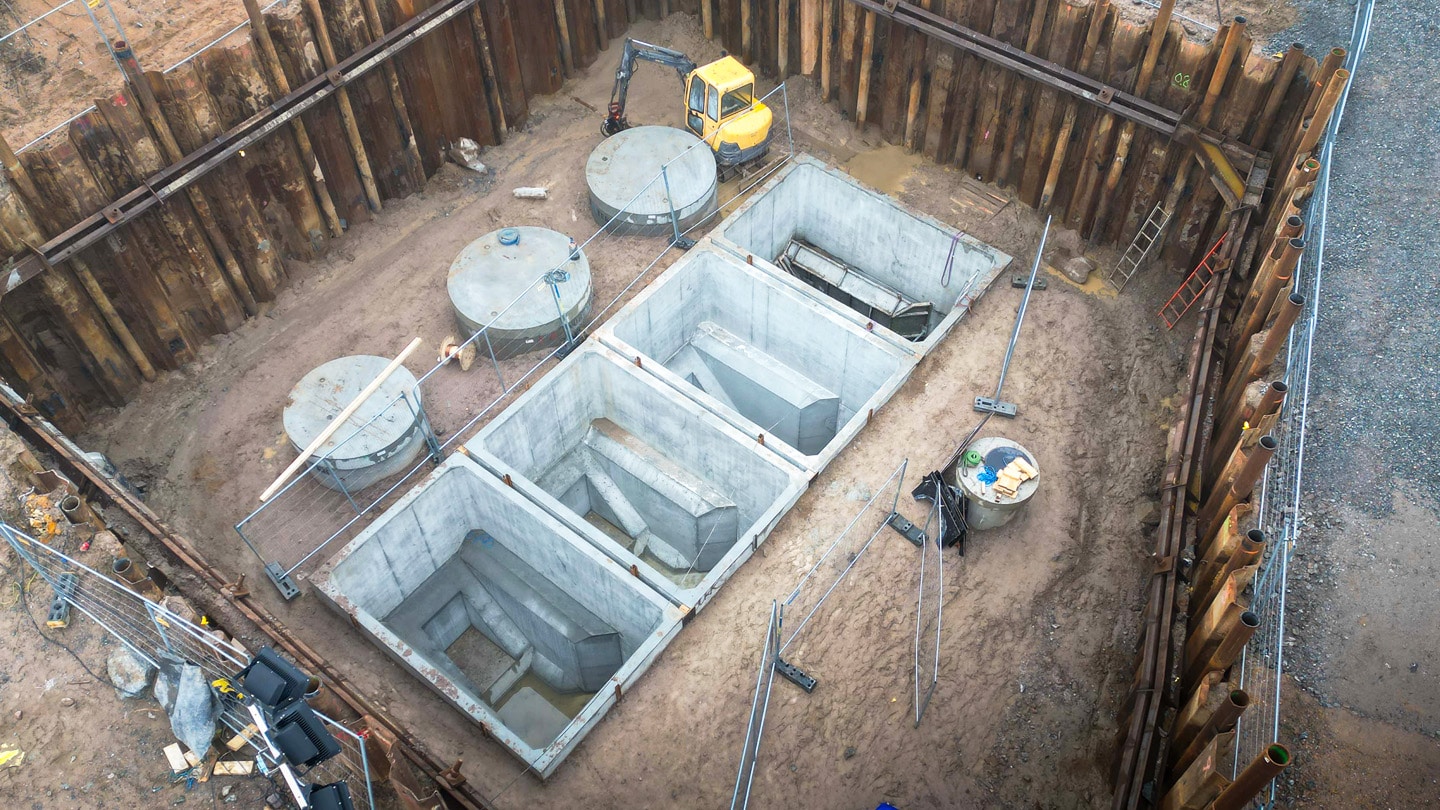 Storm Water Station hanterar stora flöden och av den anledningen bygger vi sumpen med våra betongmoduler (3 000 x 5 000). Beroende på flödets volym kombinerar vi ett lämpligt antal moduler på höjden, längden och bredden.