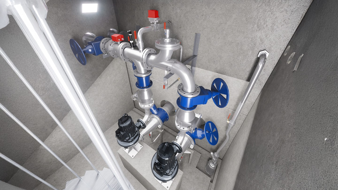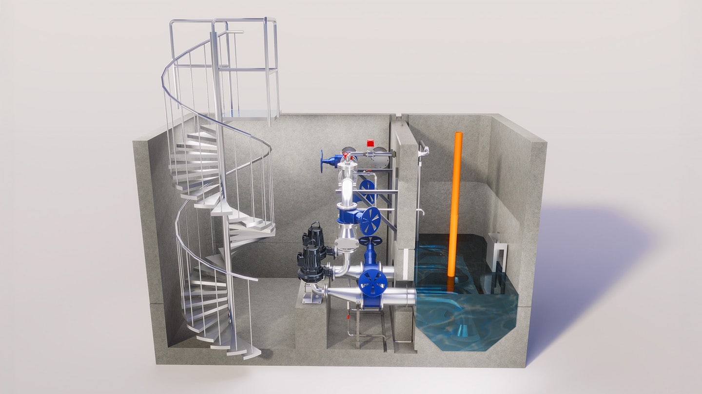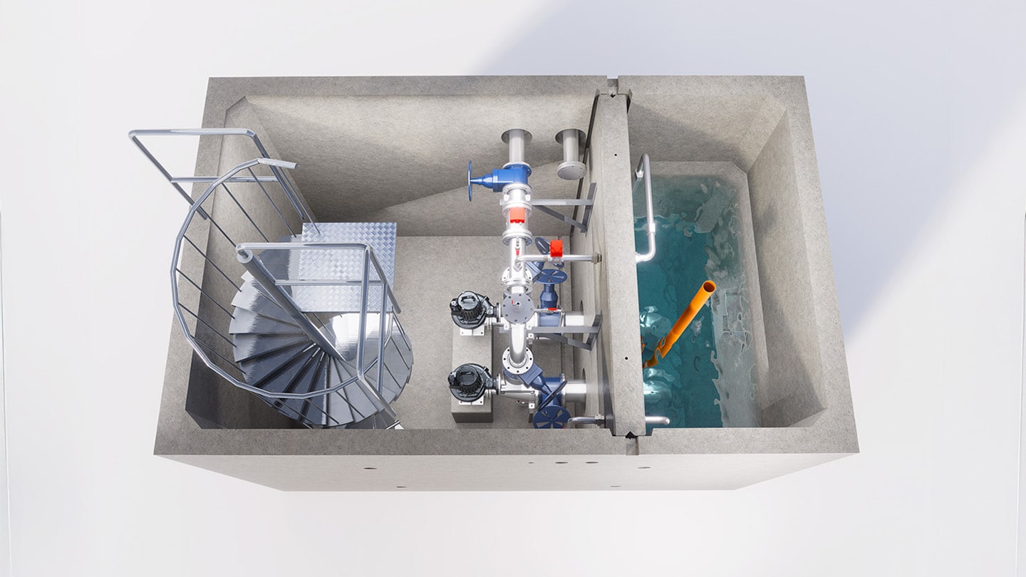 VM Pumpstation för spillvatten, med maskinrum under mark, är en efterfrågad lösning för pumpning av kommunalt spillvatten. Konstruktionen gör det möjligt att sätta ett positivt tryck på vattenpelaren och samtidigt skapa en bra arbetsmiljö med torrt uppställda pumpar i maskinrummet.